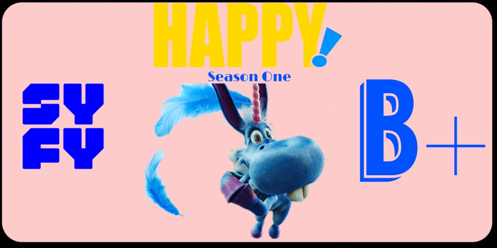 Happy! is an absolute blast! The show stars Christopher Meloni (Law & Order: SVU) as ex-cop-turned-hitman Nick Sax, and Patton Oswalt as the voice of Happy, a winged unicorn whom is the imaginary friend of young girl named Hailey. Hailey was kidnapped by a deranged and perverted man dressed as Santa Claus and now it’s up to Happy and Nick to team up and rescue Hailey!