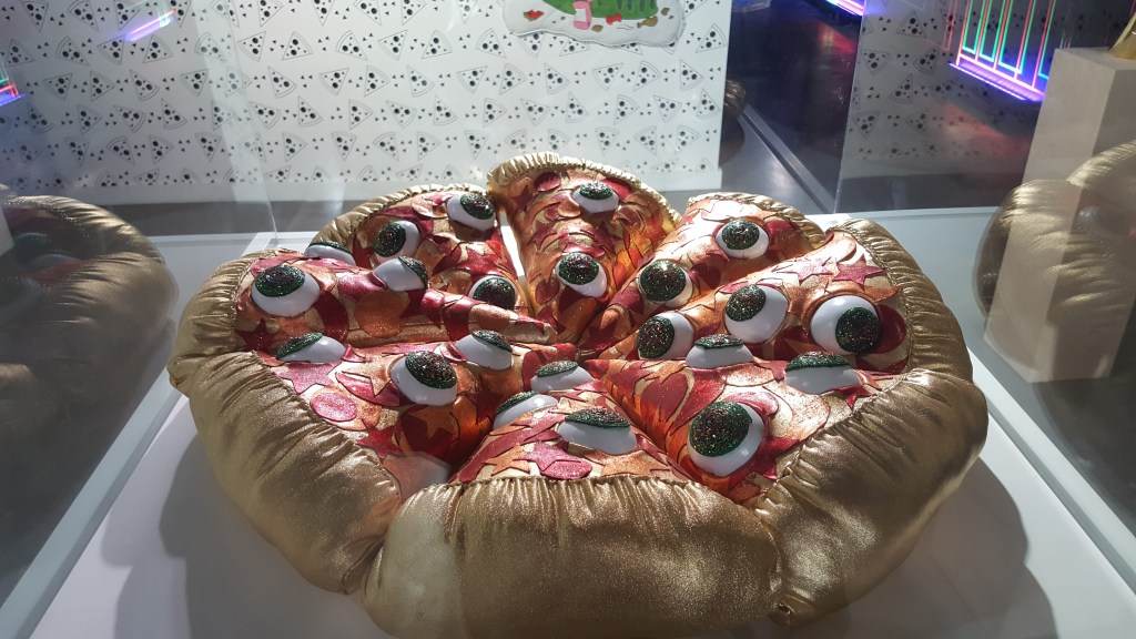 The Museum of Pizza has commissioned site-specific, pizza-inspired immersive rooms by emerging and established artists, transforming the experience into a platform for its visitors to engage with artists and for artists to reach new audiences with pizza as their shared muse. Some examples include: Pizza Beach, created by artist Adam Green, a special place in the afterlife where souls of all kinds come for a slice and The Pizza Vortex by multimedia artists Signe Pierce and Emma Stern, a fluorescent blacklight room that plays with collective conception of art history, pop culture, life on earth, and existence amongst the cosmos. The Pizza Vortex invites guests to enter the surreal multiverse straddling the past, present, and future of life in a universe governed by one constant: pizza.