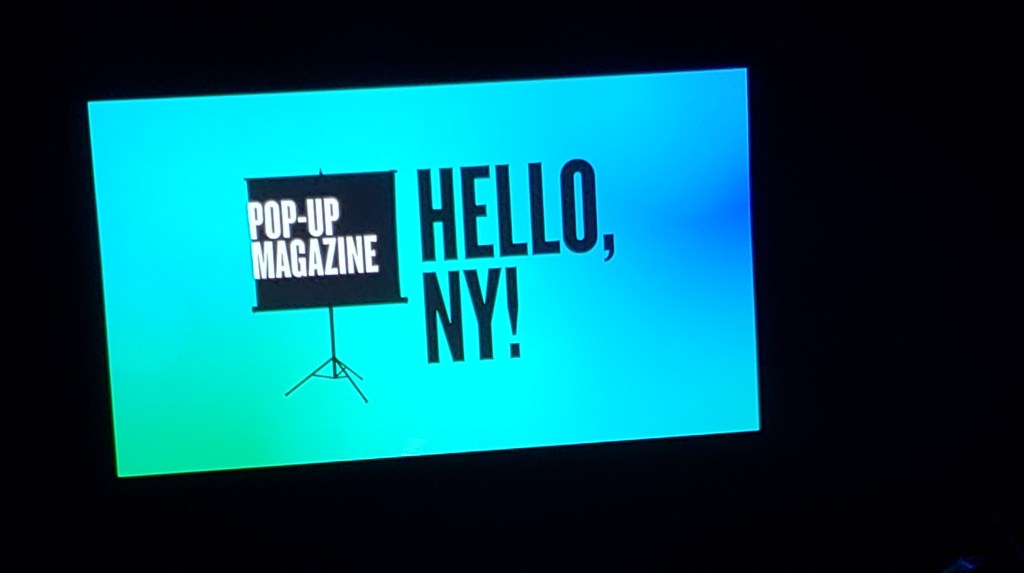 Imagine a highly styled magazine come to life. That’s what a Pop-Up Magazine experience is like. Authors read their personal pieces and animations or photographs are shown on a large screen. Quoted sections, like in an interview, are played as recorded audio. There’s musical accompaniment and live advertisements from sponsors. This past week the winter issue of Pop-Up Magazine was performed at the Brooklyn Academy of Music.