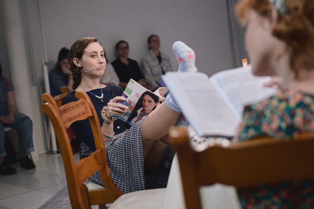 The first act takes place around a table at one of the girls’ houses, on the Jewish Sabbath where the girls have gathered to learn with one of their mothers, only portrayed via voiceover. Of course, the learning devolves into lots of rich conversation through which we meet the six teenagers and their personas. All of them carry the name of important women in the Bible, where they play more supporting roles. Here as the main characters, in an all female production, through their well-written dialogue, Vaynberg provides a very realistic look at the experience of young women being raised in a world that combines tradition and modernity.