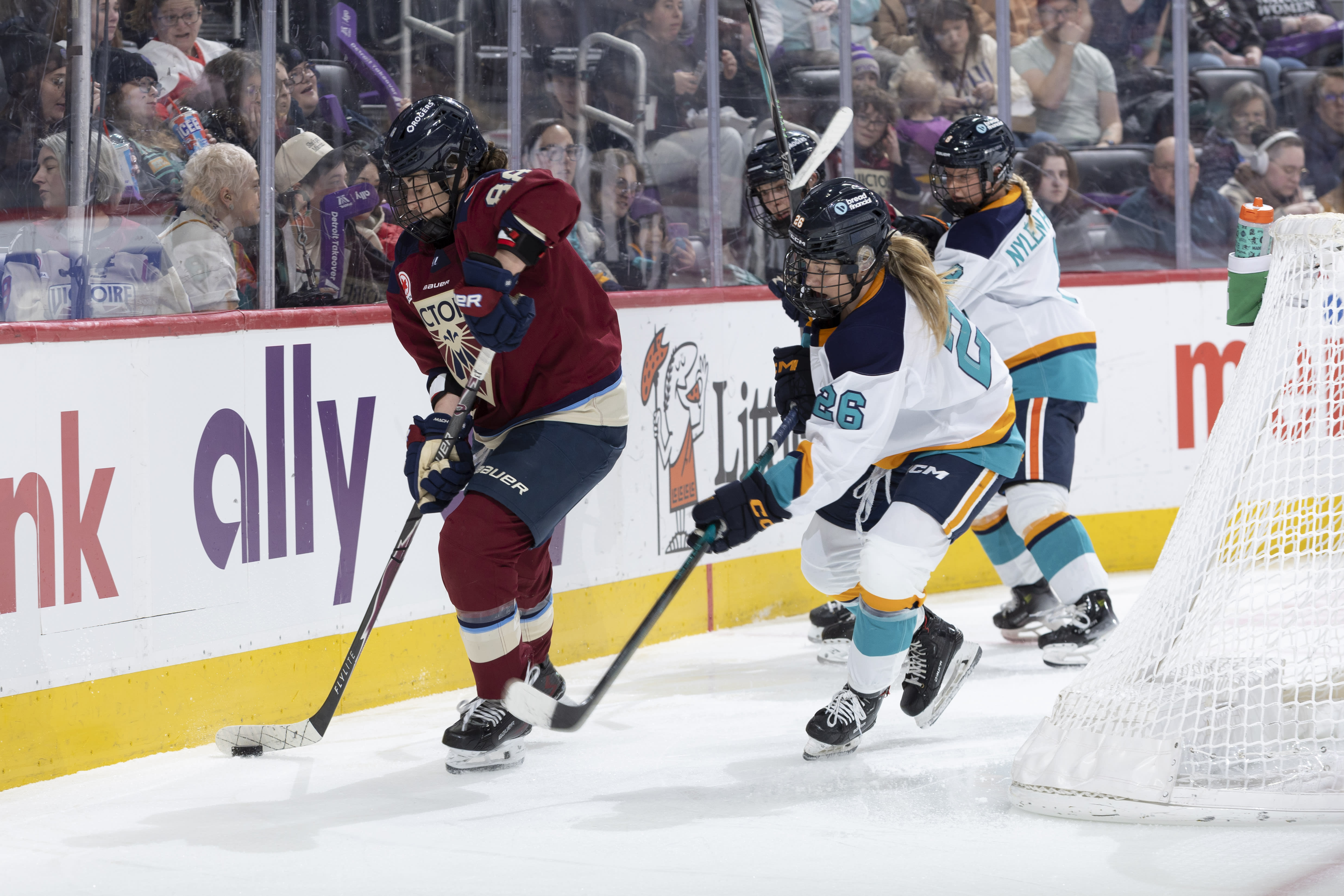 Right now, the crowd at Prudential isn’t enormous, and the ticketing setup reflects that. At the February 26th match, much of the arena was curtained off and the seating was contained to one side of the lower bowl. For now, that creates a tighter, louder, and more communal atmosphere where you can hear every whack of the puck and skid on the rink. The fan culture already has die-hards with signature bits. Although the name of the team is definitely meant to invoke imagery of mythic sea creatures, the crowd is fond of making literal siren noises. Wee-ooo! Wee-ooo!